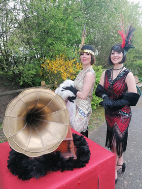 Danseuses charleston accompagnées d'un chariot musical surmonté d'un authentique gramophone